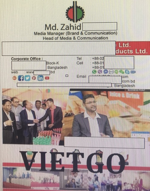 VIETGO mới đây đã nhận được liên hệ của ông Zahid đến từ Bangladesh có nhu cầu nhập khẩu sản phẩm Clinker của Việt Nam. Vị khách hàng chia sẻ công ty ông là một doanh nghiệp thương mại điện tử thiên về lĩnh vực kinh doanh đồ uống và xuất nhập khẩu. Ông cho biết: “Công ty chúng tôi là một công ty lớn gồm 23 công ty nhỏ trải rộng trên mọi lĩnh vực của đời sống. Chúng tôi nhập khẩu các loại nông sản, vật liệu xây dựng và có thể xuất khẩu các sản phẩm điện tử và đồ uống. Tôi hy vọng sẽ sớm có cơ hội được hợp tác với quý nhà cung cấp Việt Nam vì mục đích hai bên cùng có lợi”. Ông Zahid còn cho biết công ty ông có nhà máy sản xuất đồ uống tại Bangladesh có tên gọi là ██████████ & ██████████ Limited (██████████). Công ty được thành lập vào ngày 24 tháng 5 năm 2014 như một nỗ lực mới nhất của tập đoàn ██████████ để phục vụ nhu cầu ngày càng tăng về hàng tiêu dùng chất lượng ở Bangladesh. Được trang bị máy móc hiện đại, nhà máy được đặt tại Narsingdi, Bangladesh.
