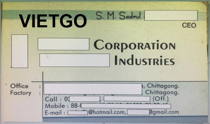 Ông Sadrul ██████████ là vị khách hàng đến từ Bangladesh thuộc công ty ██████████ Mới đây, vị khách hàng có liên hệ cho VIETGO với đơn hàng nhập khẩu 2 containers Cá thu, ông cho biết thêm ông hiện cũng đang tìm kiếm nhà cung cấp cho mặt hàng Cá Mòi, nếu nhà cung cấp có mặt hàng này thì có thể chào hàng cho ông. Ông cho biết đây là một đơn hàng GẤP cần được báo giá sớm nhất có thể, rất mong các nhà cung cấp có thể hỗ trợ ông nhanh nhất có thể.