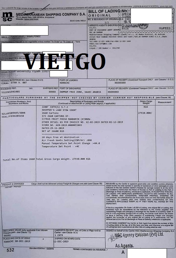 Hình ảnh vận đơn nhập khẩu cam, ngày 12/11/2019 từ Cảng Karachi, Pakistan