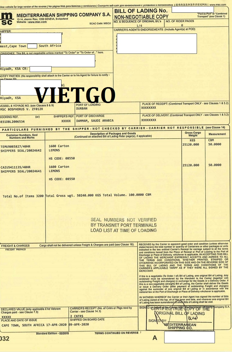 Hình ảnh bản vận đơn nhập khẩu chanh, ngày 9/4/2020, từ cảng Cape Town, Châu Phi