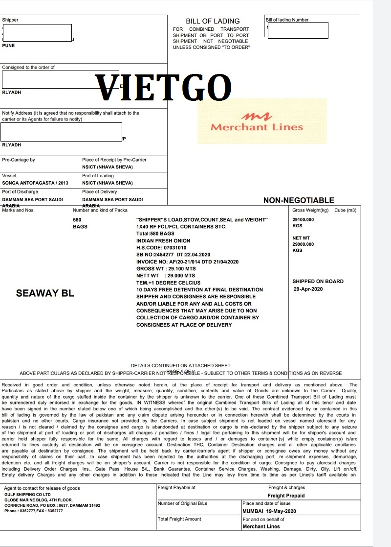 Hình ảnh bản vận đơn nhập khẩu hành tím, ngày 19/5/2020, từ cảng Mumbai, Ấn Độ