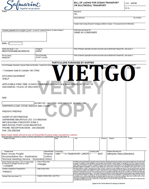 Để củng cố thêm lòng tin cho Quý vị, ông Ballgobin đã gửi đến Quý vị vận đơn BL (Bill of Lading) của chuyến hàng nhập khẩu mà Công ty ông đã nhập khẩu thành công tại cảng Nansha, thuộc tỉnh Quảng Đông,Trung Quốc.