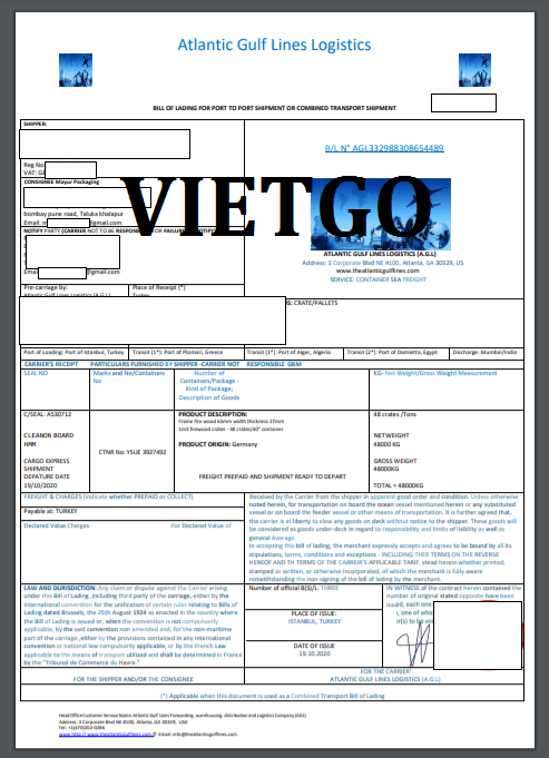 Để củng cố niềm tin cho Quý vị, Ông Shailesh đã gửi đến Quý vị một Vận đơn BL (Bill of Lading) của một chuyến hàng nhập khẩu thành công Khung gỗ từ Thổ Nhỹ Kỳ đến Ấn Độ.