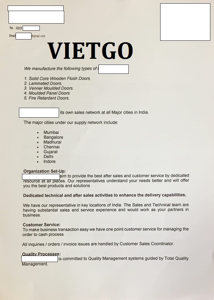 Ông Shailesh, hiện đang là đại diện cho công ty ██████████ – Công ty ông chuyên cung cấp các sản phẩm, dịch vụ tốt nhất về Cửa gỗ, Cửa dát mỏng, Cửa đúc, Cửa chống cháy với 100% chống nước, một số loại cửa được ưu tiên sử dụng keo chống bắt lửa, chống cháy... cho tất cả các khách hàng trên toàn thế giới....Ở thời điểm hiện tại, ông là người chịu trách nhiệm dự án Làm Cửa theo thiết kế và định hướng mới của công ty ông, nên ông liên hệ và cung cấp cho VIETGO chi tiết, số lượng, kích thước với hy vọng rằng VIETGO sẽ tìm ra được nhà cung cấp phù hợp cho đơn hàng của mình. Quý doanh nghiệp nào có thể đáp ứng được yêu cầu của ông, vui lòng báo giá gấp và gửi chi tiết qua email cho ông.