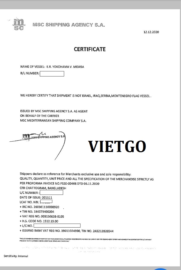 Để Qúy vị có thể tin tưởng ông là vị khách hàng tiềm năng và có kinh nghiệm trong việc nhập khẩu hàng hoá, ông xin được gửi bản chứng chỉ cho đơn hàng nhập khẩu sản phẩm nông sản từ Trung Quốc mà mới đây mà công ty ông đã giao dịch thành công: