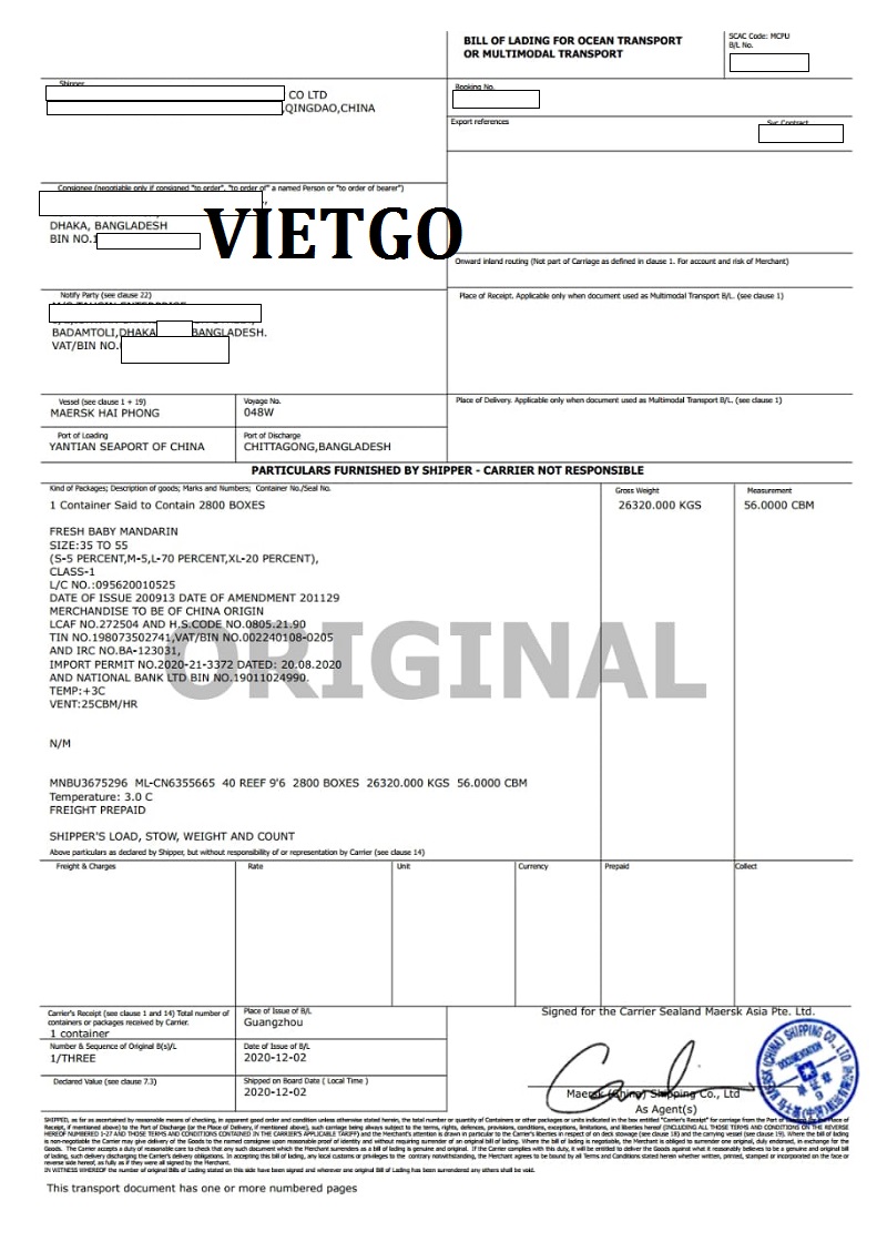 Hình ảnh bản vận đơn nhập khẩu cho đơn hàng nhập khẩu Quýt từ Trung Quốc