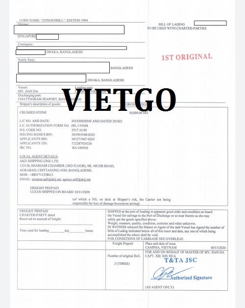 Hình ảnh vận đơn nhập khẩu đá xây dựng từ Việt Nam của công ty ông Anowar vào năm 2020