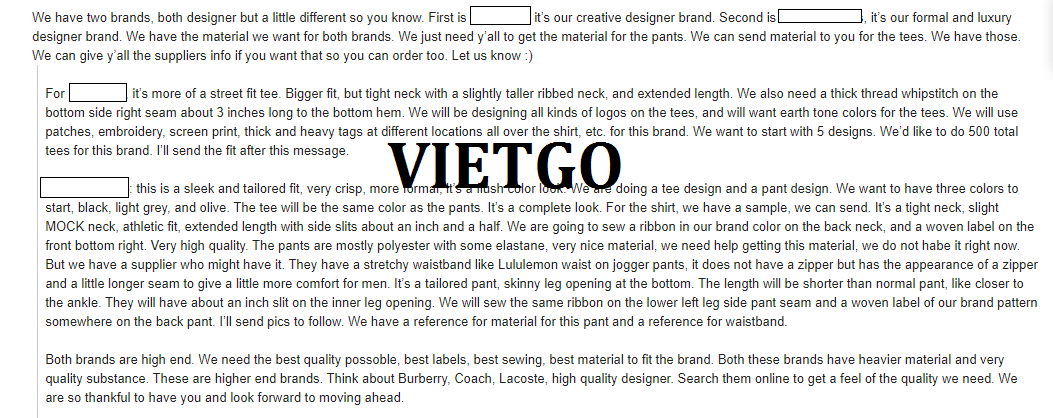 “Cả hai thương hiệu đều cao cấp. Chúng tôi cần thấy được chất lượng tốt nhất, nhãn hiệu tốt nhất, đường may tốt nhất, chất liệu tốt nhất để phù hợp với thương hiệu mà chúng tôi đang gây dựng. Cả hai thương hiệu này đều cần có chất liệu cao cấp và đạt được chất lượng tiêu chuẩn. Đây đều là những thương hiệu đắt giá và cao cấp. Hãy nghĩ về Burberry, Coach, Lacoste, với thiết kế chất lượng cao, tìm kiếm thông tin về các nhãn hàng này trên mạng internet để cảm nhận chất lượng chúng tôi cần. Chúng tôi rất cảm ơn khi nhận được sự hợp tác từ phía các bạn và mong được tiến xa hơn nữa trong mối quan hệ giữa hai bên”– Trích từ thư ngỏ của vị khách hàng.