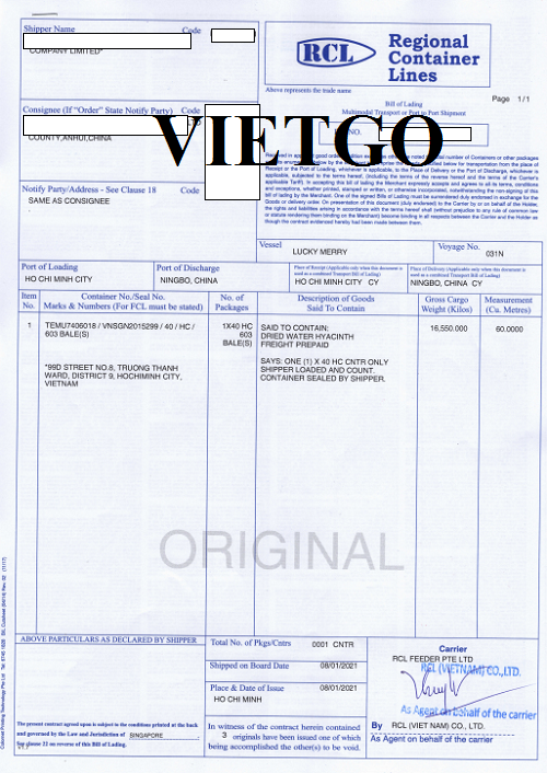 Với kinh nghiệm lâu năm của mình trong lĩnh vực nhập khẩu, anh Tú còn chia sẻ rằng anh rất hay nhập khẩu hàng Việt Nam cho công ty mình do chất lượng và giá cả phù hợp cho thị trường Trung Quốc. Dưới đây là bản vận đơn của một chuyến hàng anh nhập khẩu thành công 1 container 40HC sản phẩm lục bình của doanh nghiệp Việt Nam từ cảng Hồ Chí Minh đến cảng Ninh Ba, Trung Quốc.