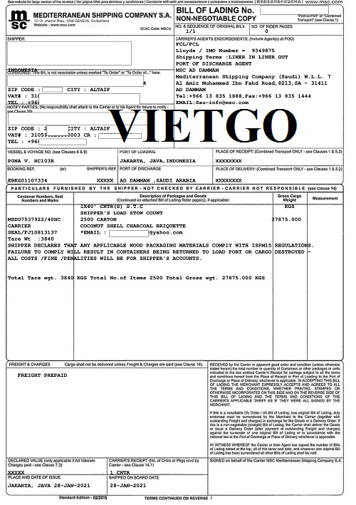 Vận đơn nhập khẩu 27 tấn than dừa từ Indonesia vào ngày 29/1/2021