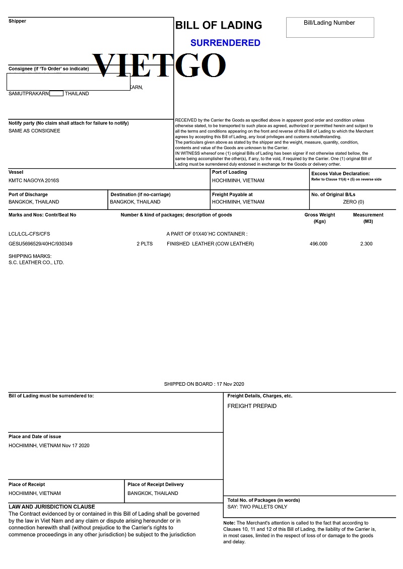 Dưới đây là vận đơn của chuyến hàng nhập khẩu đồ da thành công từ cảng tại Hồ Chí Minh, Việt Nam vào ngày 17 tháng 11 năm 2020 sang thị trường Thái Lan.