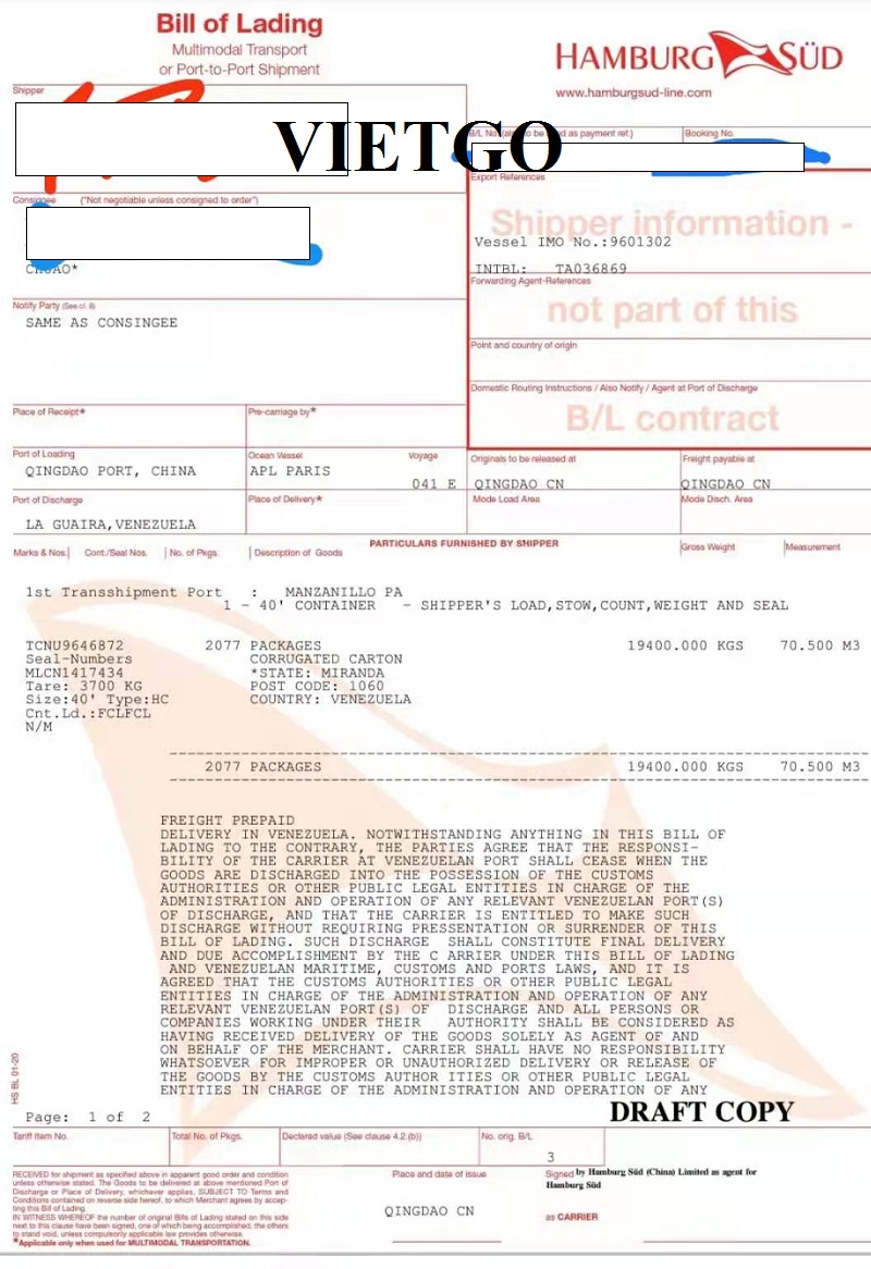 Hình ảnh vận đơn nhập khẩu mặt hàng thùng carton từ Trung Quốc của công ty ông Aristide vào tháng 12 năm 2020