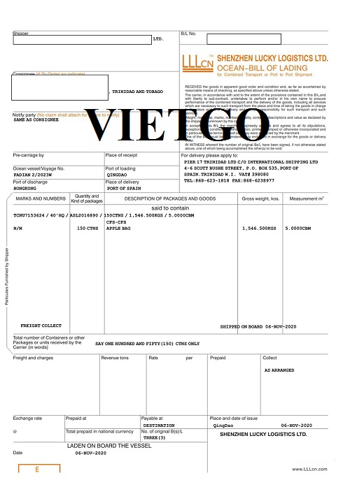 Dưới đây là hình ảnh một vận đơn đường biển (Bill of Lading) của một chuyến hàng nhập khẩu thành công mặt hàng táo từ Trung Quốc.