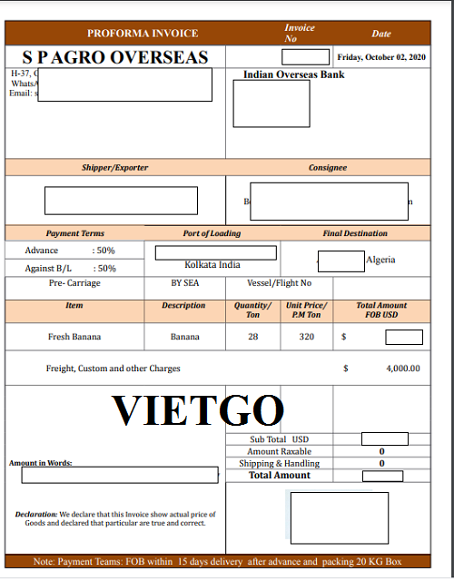 Hình ảnh hóa đơn chiếu lệ của đơn hàng xuất khẩu chuối sang Algeria của công ty vị khách hàng