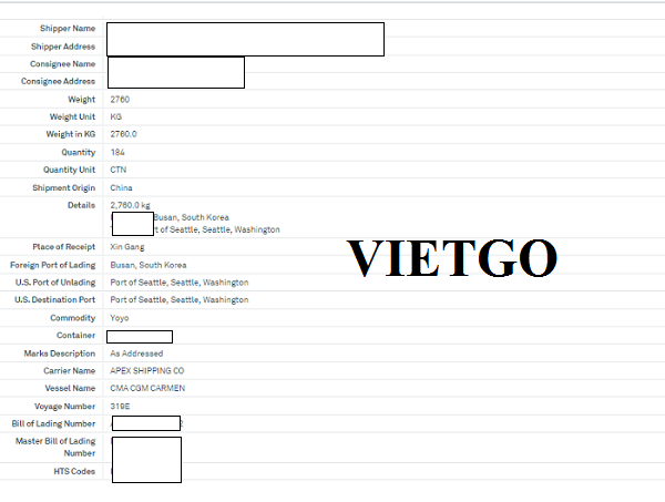 Dưới đây là một số vận đơn đường biển của công ty ông Simon cho mặt hàng yoyo sang thị trường Mỹ: