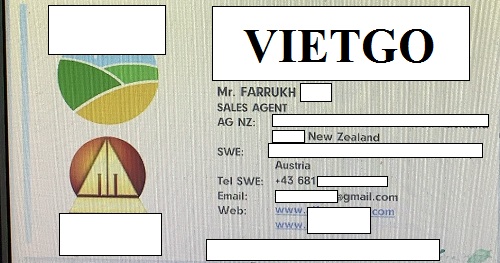“Xin chào, tôi rất vui khi được biết đến một công ty như Vietgo. Tôi là Farrukh ██████████ đến từ Vienna, Áo. Hiện tại tôi đang làm việc với một công ty chuyên cung cấp các sản phẩm thức ăn chăn nuôi cho các nước Đông Nam Á như ngô vàng, lúa mì, lúa mạch, v.v. với tên gọi ██████████. Công ty của tôi là đại lý duy nhất làm việc với người mua cuối cùng là tập đoàn ██████████ ██████████.