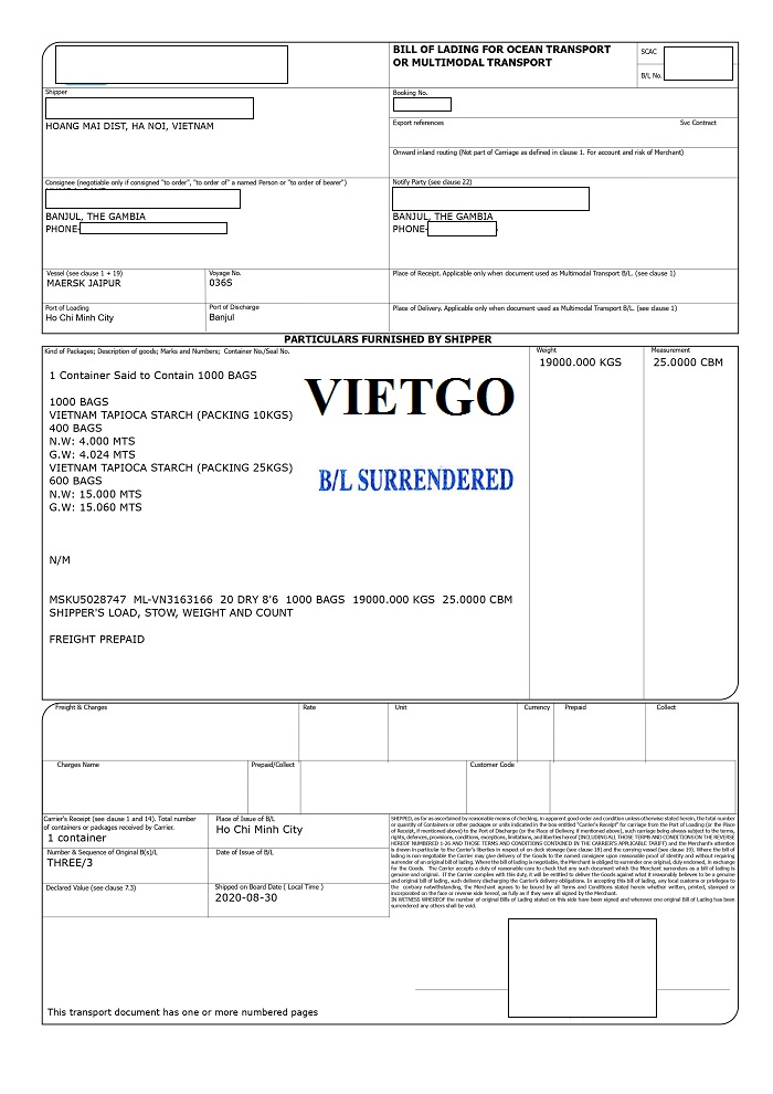 Dưới đây là vận đơn nhập khẩu tinh bột sắn từ Việt Nam vào ngày 30 tháng 08 năm 2020 của công ty vị khách hàng: