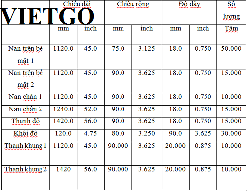 Hình ảnh số lượng và thông số sản phẩm do khách hàng cung cấp (số lượng để làm 1 pallet) - bản dịch tiếng Việt