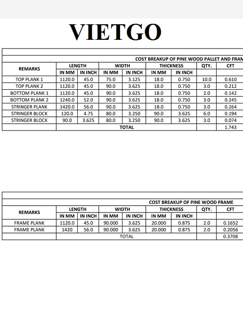 Hình ảnh thông số và số lượng sản phẩm do khách hàng cung cấp (số lượng để làm 1 pallet) - bản dịch tiếng Anh