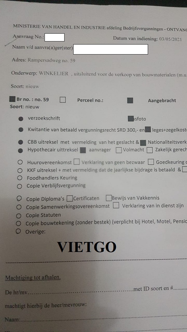Hình ảnh giấy phép nhập khẩu của công ty ông Sachin bằng tiếng Hà Lan (lý do là vì Suriname từng là thuộc địa của Hà Lan)
