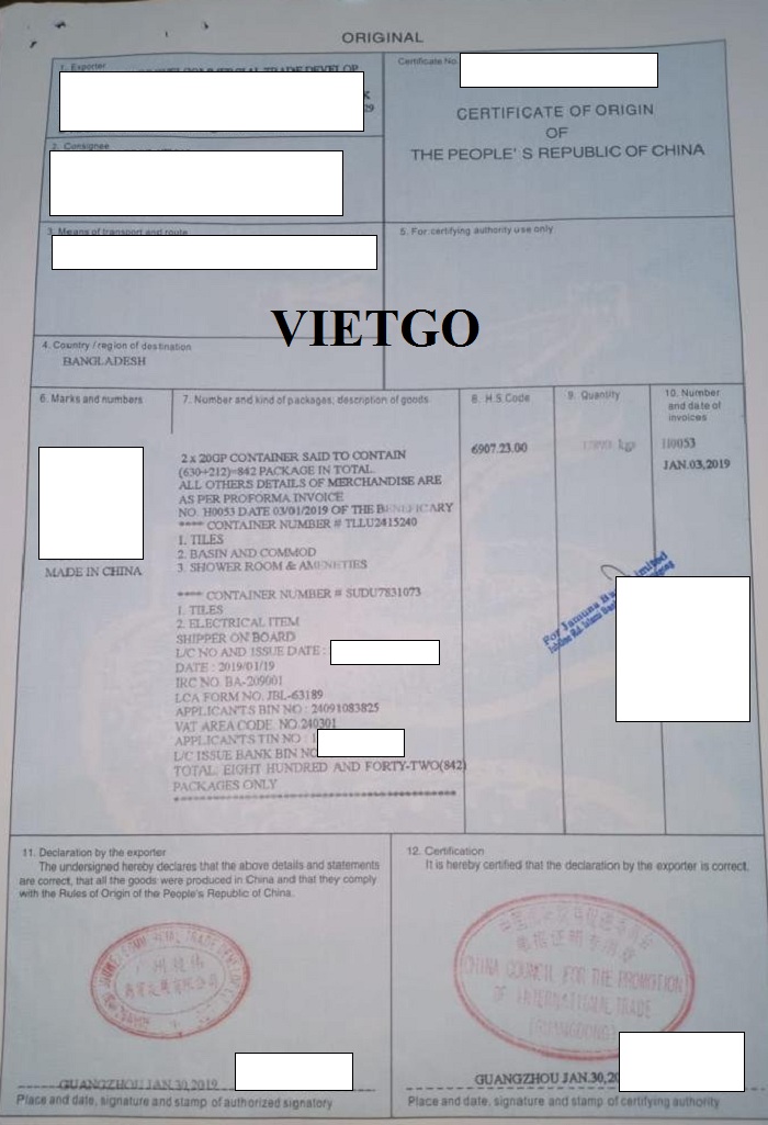 Hình ảnh giáy chứng nhận nguồn gốc xuất xứ lô hàng nhập khẩu của công ty vị khách hàng