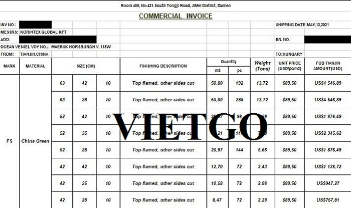 Dưới đây là hình ảnh tờ hóa đơn thương mại của đơn hàng nhập khẩu gỗ từ Trung Quốc