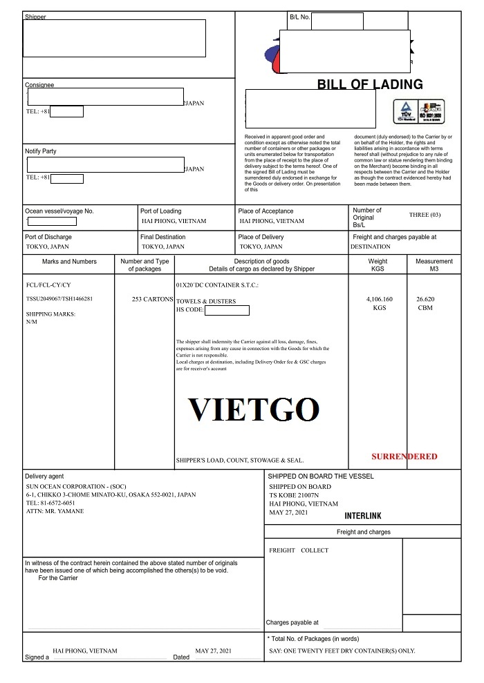 Dưới đây là vận đơn nhập khẩu sản phẩm khăn bông từ thị trường Việt Nam bởi công ty vị khách hàng vào ngày 27/5/2021