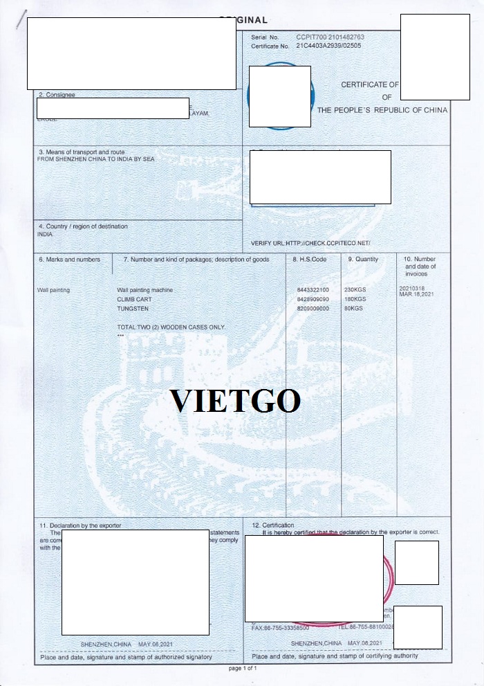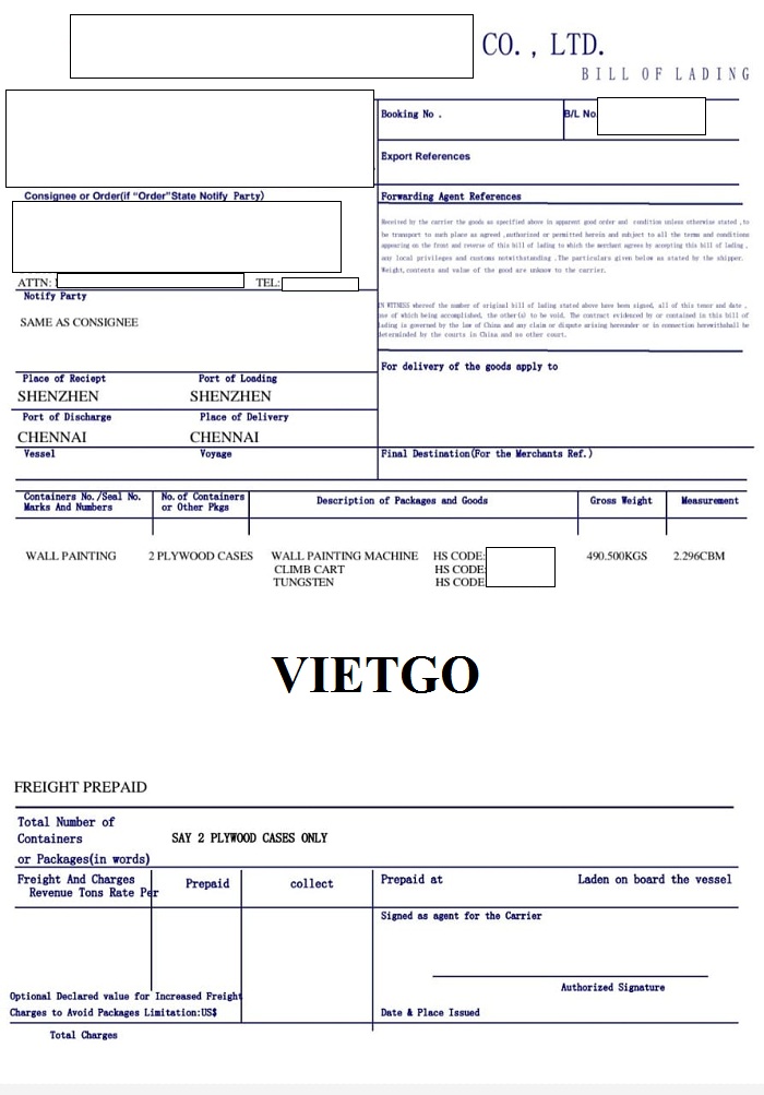 Dưới đây là hình ảnh một vận đơn đường biển (Bill of Lading) và giấy chứng nhận xuất xứ (Certificate of Origin) của một chuyến hàng nhập khẩu thành công máy sơn tường từ Trung Quốc.