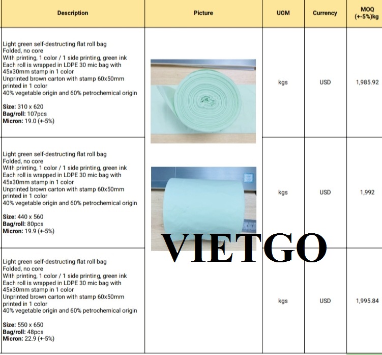 VIETGO xin gửi tới Quý vị thông tin nhu cầu nhập khẩu số lượng lớn túi PE sử dụng 1 lần từ vị khách hàng đến từ Ấn Độ