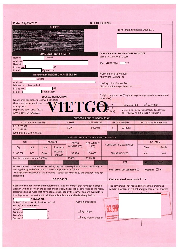 Hình ảnh vận đơn chuyến hàng nhập khẩu hạt me của công ty vị khách hàng