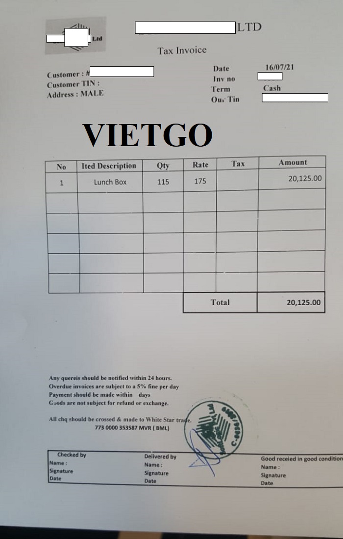 Hình ảnh hóa đơn thuế giá trị gia tăng của công ty ██████████Pvt Ltd