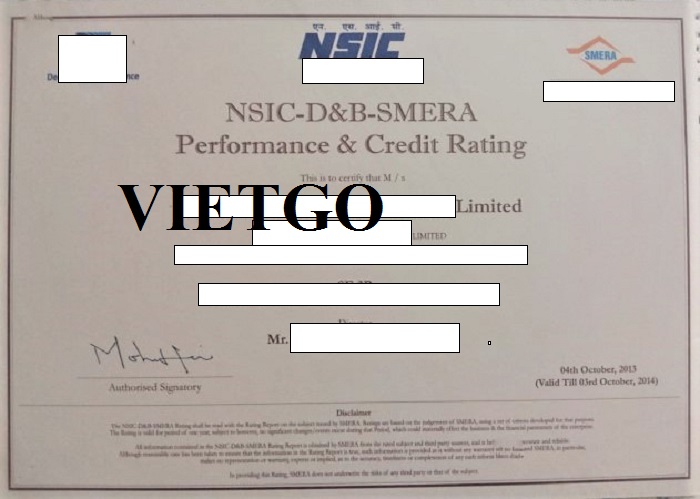 Hình ảnh giấy chứng nhận của công ty vị khách hàng được cấp bởi Cơ quan Đánh giá Doanh nghiệp vừa và nhỏ (SMERA)