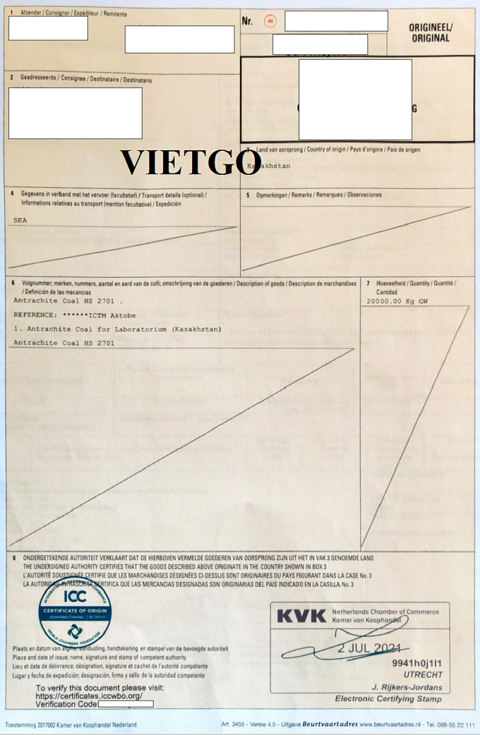Dưới đây là giấy chứng nhận xuất xứ cho chuyến hàng nhập khẩu 20 tấn than Anthracite của công ty vị khách hàng từ Doetinchem, Hà Lan ngày 02/07/2021: