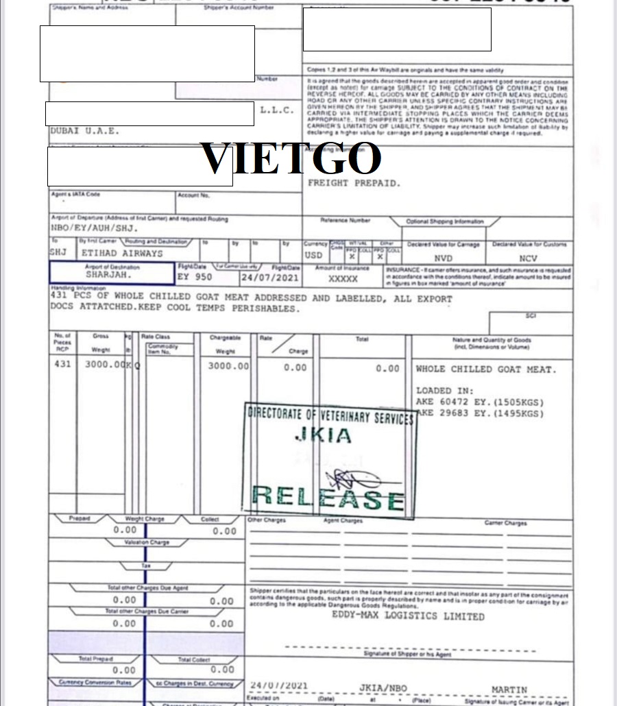 Dưới đây là bản vận đơn hàng không cho chuyến nhập khẩu 3 tấn thịt dê của công ty vị khách hàng từ Kenya đến UAE ngày 24/07/2021: