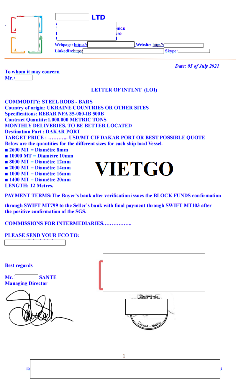 Ông ██████████Sante là vị khách hàng đến từ nước Ý. Ông hiện giữ vai trò là Tổng giám đốc công ty ██████████LTD. Được thành lập vào năm 1964, ██████████LTD là một công ty kinh doanh và xuất nhập khẩu tại Malta, châu Âu với mô hình kinh doanh của công ty dựa trên việc mua hàng hóa với số lượng lớn từ nhiều nhà cung cấp và phân phối cho khách hàng. Mới đây, ông Sante có nhận được yêu cầu nhập khẩu từ một vị khách hàng đến từ Senegal với số lượng lớn thép thanh vằn để phục vụ cho dự án xây dựng tại địa phương. Được biết, VIETGO cùng với mô hình hoạt động đa dạng giúp tìm kiếm kết nối người mua với nhiều nhà cung cấp tại châu Á, do vậy ông Sante đã không ngần ngại tìm đến chúng tôi cho đơn hàng tiềm năng này.