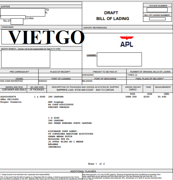 Dưới đây là bản vận đơn nhập khẩu mặt hàng vali từ Trung Quốc tới thị trường Indonesia vào ngày 19/9/2019 của công ty vị khách hàng.