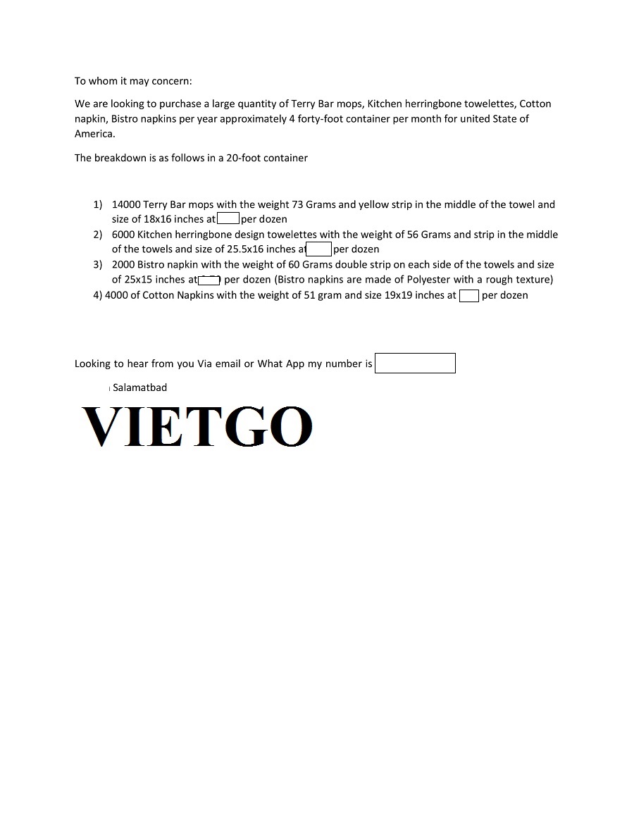 VIETGO đã nhận được thông tin đơn hàng từ ông Salamat – vị khách hàng đến từ Hoa Kỳ đang tìm kiếm nhà cung cấp cho mặt hàng khăn bông