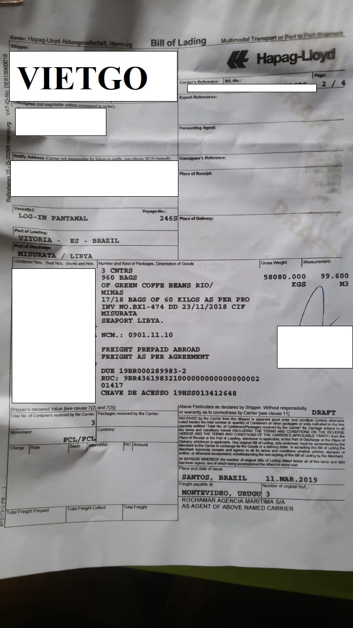 Dưới đây là bản vận đơn nhập khẩu 3 container hạt cà phê từ cảng Vitoria, Brazil đến cảng Misurata, Libya vào ngày 11/03/2019 do công ty của vị khách hàng thực hiện: