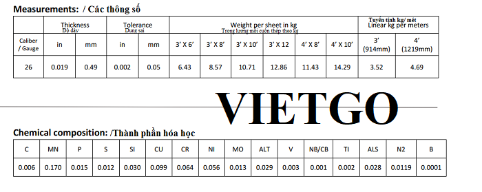 Kích thước: Rộng 122cm, dày 0.49mm, khổ thép 26 gauge