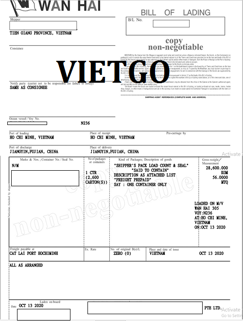 Bản thân ông Sun là người đã từng trực tiếp nhập khẩu nhiều lô hàng từ các quốc gia khác nhau trong đó có cả Việt Nam. Vị khách hàng cho biết mới đây công ty ông đã nhập khẩu thử một container hải sản từ một nhà cung cấp tại tỉnh Tiền Giang, Việt Nam. Container hàng này được vận chuyển từ cảng Cát Lái, Hồ Chí Minh sang cảng Giang Tô của Trung Quốc vào ngày 13 tháng 10 năm 2020. Dưới đây là bản vận đơn nhập khẩu sản phẩm hải sản của công ty ông Sun mới giao dịch vừa qua:
