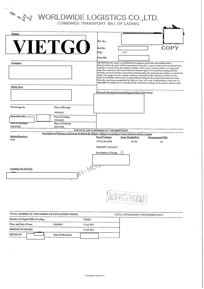 Dưới đây là bản vận đơn chuyến hàng nhập khẩu ống thép hàn xoắn từ Trung Quốc mà công ty ông Ewa đã thực hiện thành công vào ngày 12 tháng 07 năm 2021:
