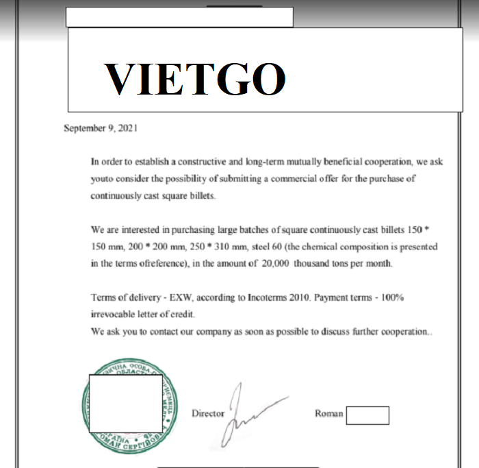 Để thiết lập mối quan hệ hợp tác mang tính xây dựng và lâu dài cùng có lợi, ông Roman đã trực tiếp liên hệ với VIETGO đề nghị được kết nối với các nhà cung cấp thép tại thị trường châu Á. Công ty ông Roman hiện đang cần nhập khẩu 20.000 tấn phôi thép hàng tháng và 3.000 chiếc cọc ván thép cho một dự án mới. Vị khách hàng mong đợi sẽ nhận được liên hệ từ các nhà cung cấp để thảo luận về việc hợp tác.