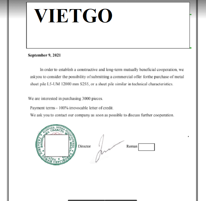 Ông Roman đến từ Ukraine đang cần tìm nhà cung cấp cọc ván thép và phôi thép số lượng lớn. VIETGO xin được gửi tới Quý nhà cung cấp thông tin chi tiết về đơn hàng của ông Roman bên dưới: