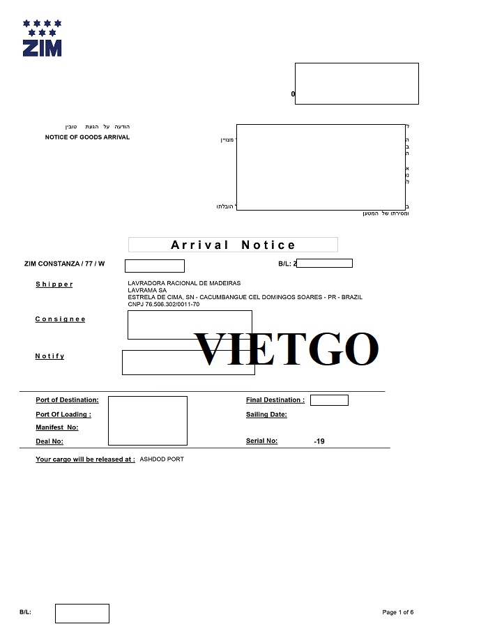 Hình ảnh giấy báo hàng đến của công ty vị khách hàng