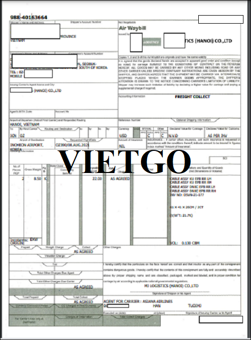 Hình ảnh vận đơn nhập khẩu mặt hàng dây cáp từ Việt Nam mà công ty đã thực hiện ngày 16/8/2021