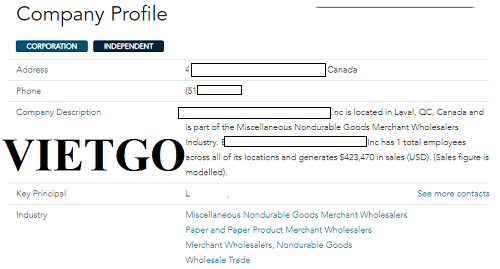 ██████████ ██████████International Inc là công ty hoạt động chính trong lĩnh vực kinh doanh các sản phẩm giấy và bìa. Công ty được thành lập vào ngày 15 tháng 2 năm 2018 và có trụ sở đặt tại Laval, Quebec, Canada. “Chúng tôi là đơn vị chuyên cung cấp giấy, các loại bìa carton cho các cửa hàng bán buôn và bán lẻ tại Laval. ██████████ ██████████International Inc tự hào đã cung cấp cho rất nhiều khách hàng trên khắp Canada. Đồng thời giúp các công ty giảm chi phí khi phải nhập giấy từ nước ngoài về nên chúng tôi đã đa dạng các loại giấy nhằm đáp ứng đầy đủ nhu cầu của khách hàng. Với phương châm "khách hàng là nền tảng giá trị", chúng tôi cố gắng hết sức để sản phẩm đạt chất lượng tốt làm hài lòng khách hàng và tạo niềm tin cho họ trong quá trình sử dụng. Chúng tôi luôn hy vọng những cố gắng của chúng tôi sẽ được ủng hộ bởi khách hàng và đóng góp vào sự phát triển ngành giấy của nước nhà”, vị khách hàng chia sẻ.