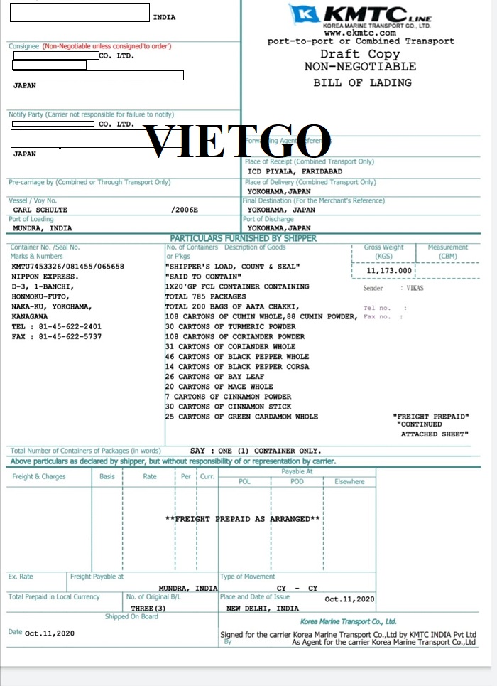Dưới đây là hình ảnh 01 bản vận đơn của chuyến hàng nhập khẩu các loại gia vị từ Ấn Độ vào Nhật Bản ngày 11/10/2020 mà công ty anh đã thực hiện thành công: