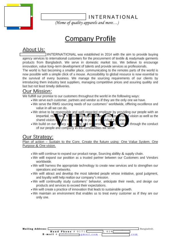 Được biết ██████████ INTERNATIONAL được thành lập vào năm 2014 tại Dhaka – thủ đô của Bangladesh. Công ty chủ yếu hoạt động trong lĩnh vực thương mại hàng hóa trên quy mô quốc tế. Những ngày đầu thành lập ██████████ INTERNATIONAL cam kết cung cấp tới khách hàng trong và ngoài nước các sản phẩm may mặc và hàng may sẵn được sản xuất tại Bangladesh với giá thành và chất lượng đa dạng. Hiện mạng lưới khách hàng của ██████████ INTERNATIONAL không chỉ được mở rộng mà còn ngày càng ổn định hơn. Với hơn 7 năm hoạt động, ông Reza ngày càng tạo dựng được mối quan hệ đối với những đối tác chất lượng cao từ những thị trường tiềm năng của mình tại châu Âu và châu Mỹ. Vị khách hàng cho thấy bản thân ông luôn đặt chữ tín trong kinh doanh lên cao hơn tất cả. Tại thời điểm công nghệ thông tin ngày càng phát triển, con người có thể tiếp cận các tài nguyên, giao dịch, đàm phán và hợp tác với chỉ một cú nhấp chuột thì những giá trị đạo đức, sự chân thành và lòng trung thành càng trở nên cần thiết để có một mối quan hệ hợp tác khăng khít và lâu dài. Vì vậy vị khách hàng người Bangladesh rất hy vọng có thể thông qua VIETGO để làm việc với những nhà cung cấp uy tín và phù hợp trong đơn hàng này.