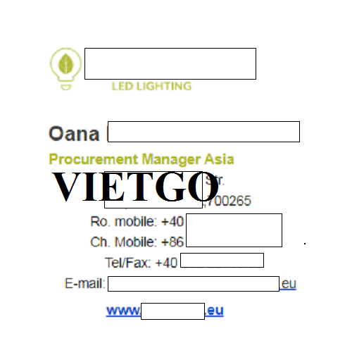 Bà Oana ████████████████████là vị khách hàng người Romania, hiện đang điều hành công ty riêng chuyên về lĩnh vực sản xuất đèn điện tại địa phương có tên là ██████████. Liên hệ trực tiếp với VIETGO, bà Oana có gửi tới chúng tôi đơn hàng nhập khẩu sản phẩm ống tre theo yêu cầu của bà để phục vụ cho một dự án mới của công ty tại Romania. Vị khách hàng cũng bày tỏ mong muốn VIETGO sẽ giúp bà kết nối với những nhà cung cấp tiềm năng cho sản phẩm ống tre tại châu Á, đặc biệt là Việt Nam.