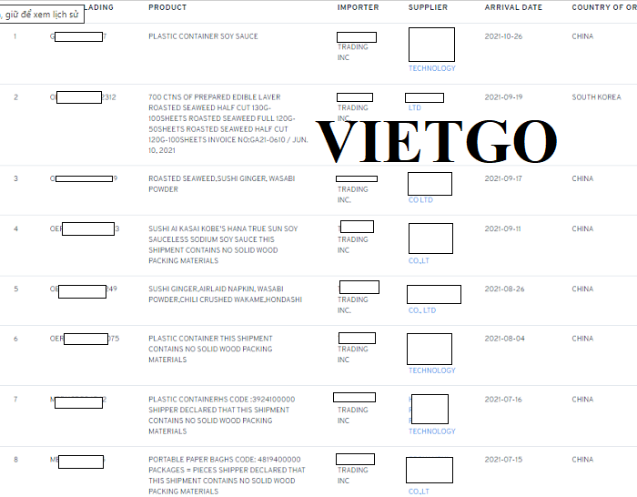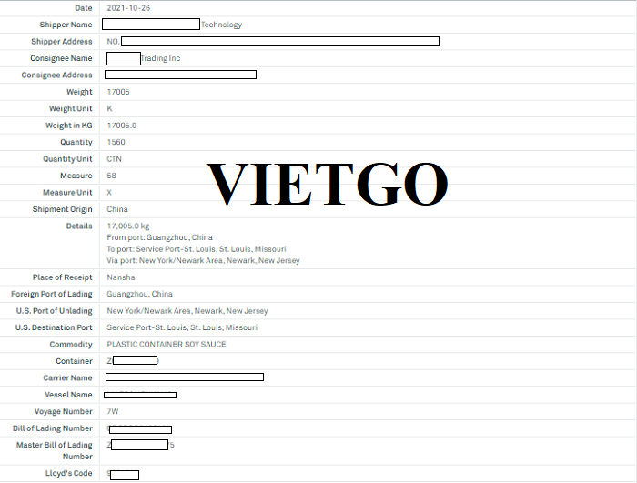 Hình ảnh vận đơn nhập khẩu túi nhựa đựng nước tương từ Trung Quốc mà công ty đã thực hiện thành công vào tháng 10 năm 2021